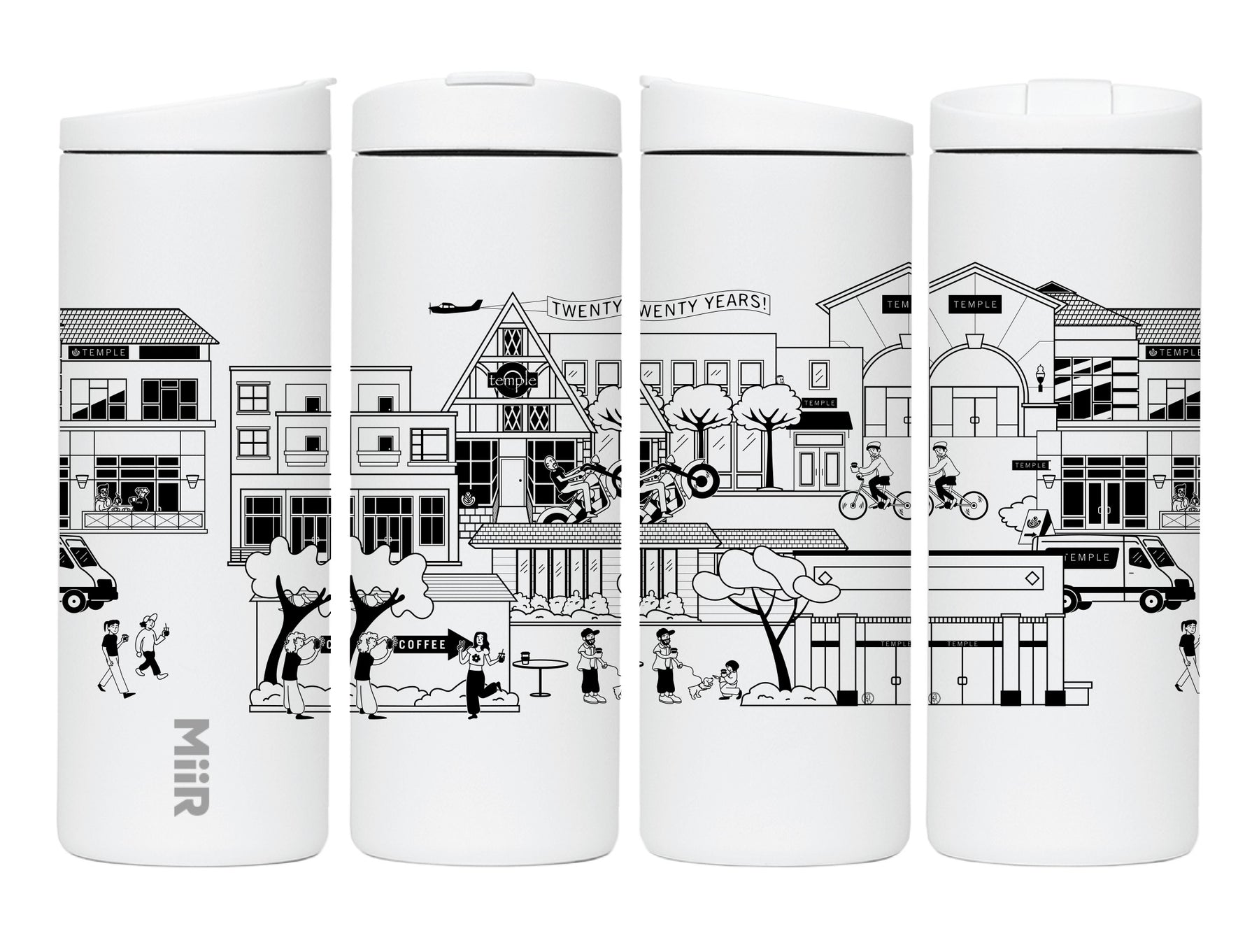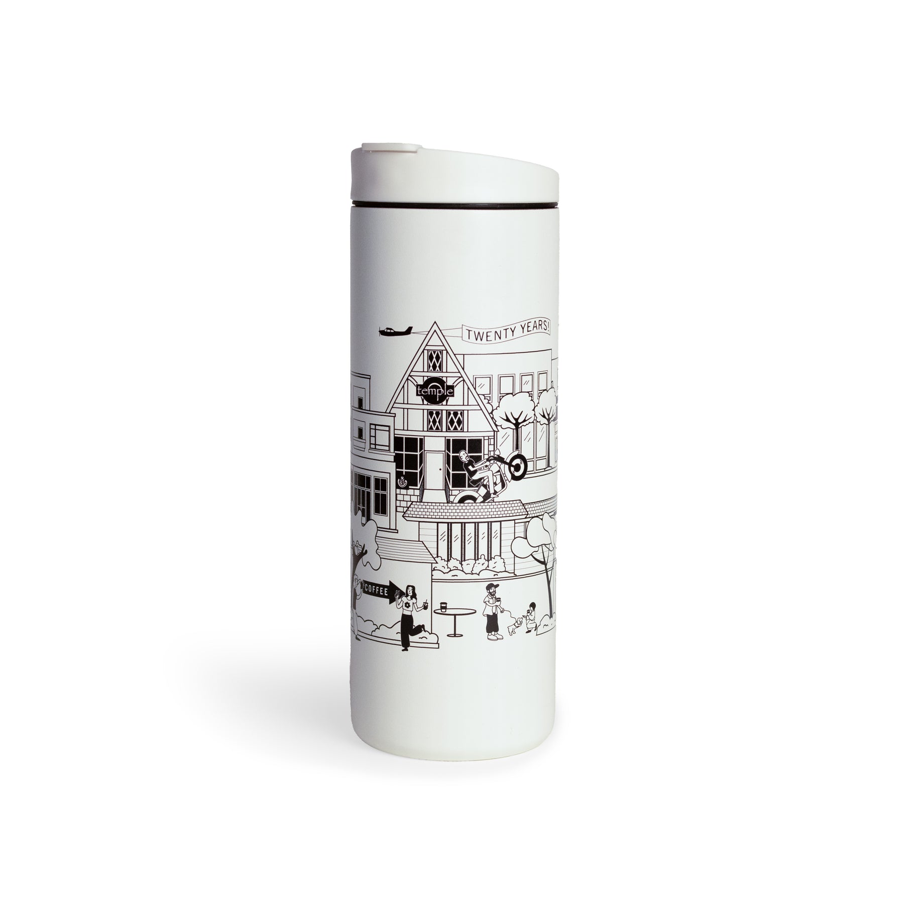 Celebrate twenty years of Temple Coffee with this special-edition tumbler featuring an illustrated cityscape of all our cafes, past and present. From our original 10th Street location to our newest spaces, each building is captured alongside scenes of our community enjoying coffee, conversation, and connection.